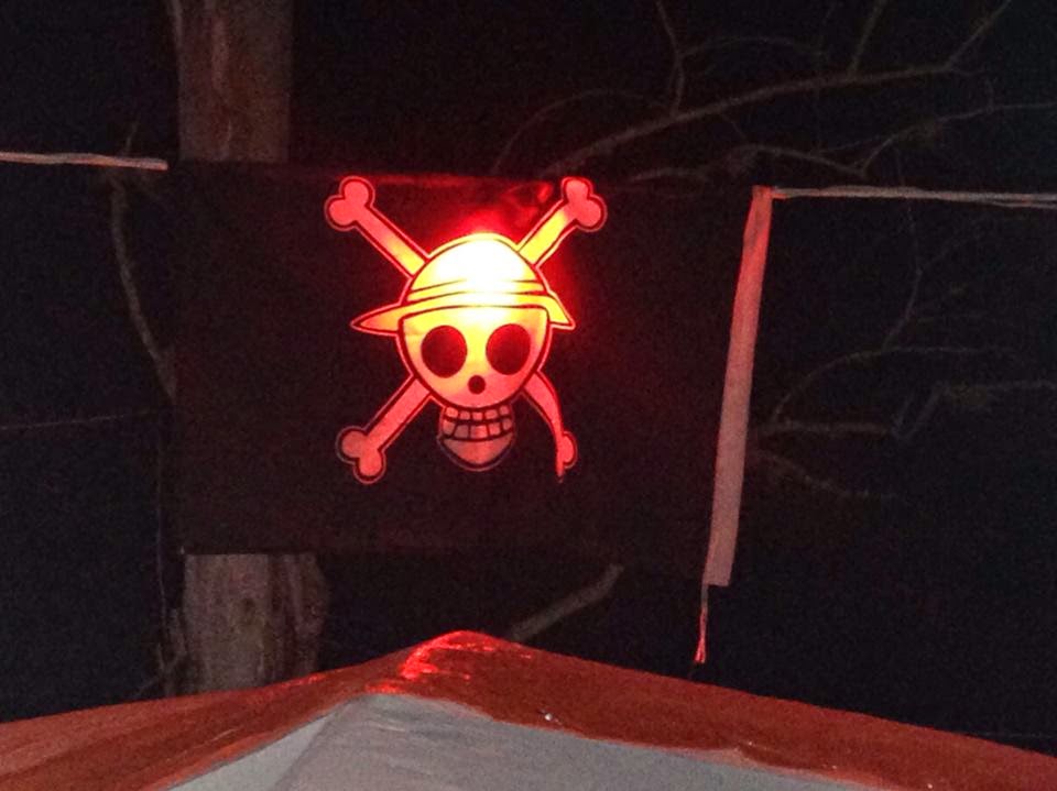 QG Pirata*: local que escolhemos para juntar as tralhas, lonas, gazebos, etc, onde ficamos juntos o tempo todo. Ele leva esse nome pois, em acampadas anteriores alguma mente infeliz (da nossa turma) resolveu hastear bandeiras piratas, colocar luz vermelha e dessa vez até um giroflex para demarcar a área pirata - se você não entendeu ainda, não entre no google, pois é uma idiotice total nossa....kkkk
